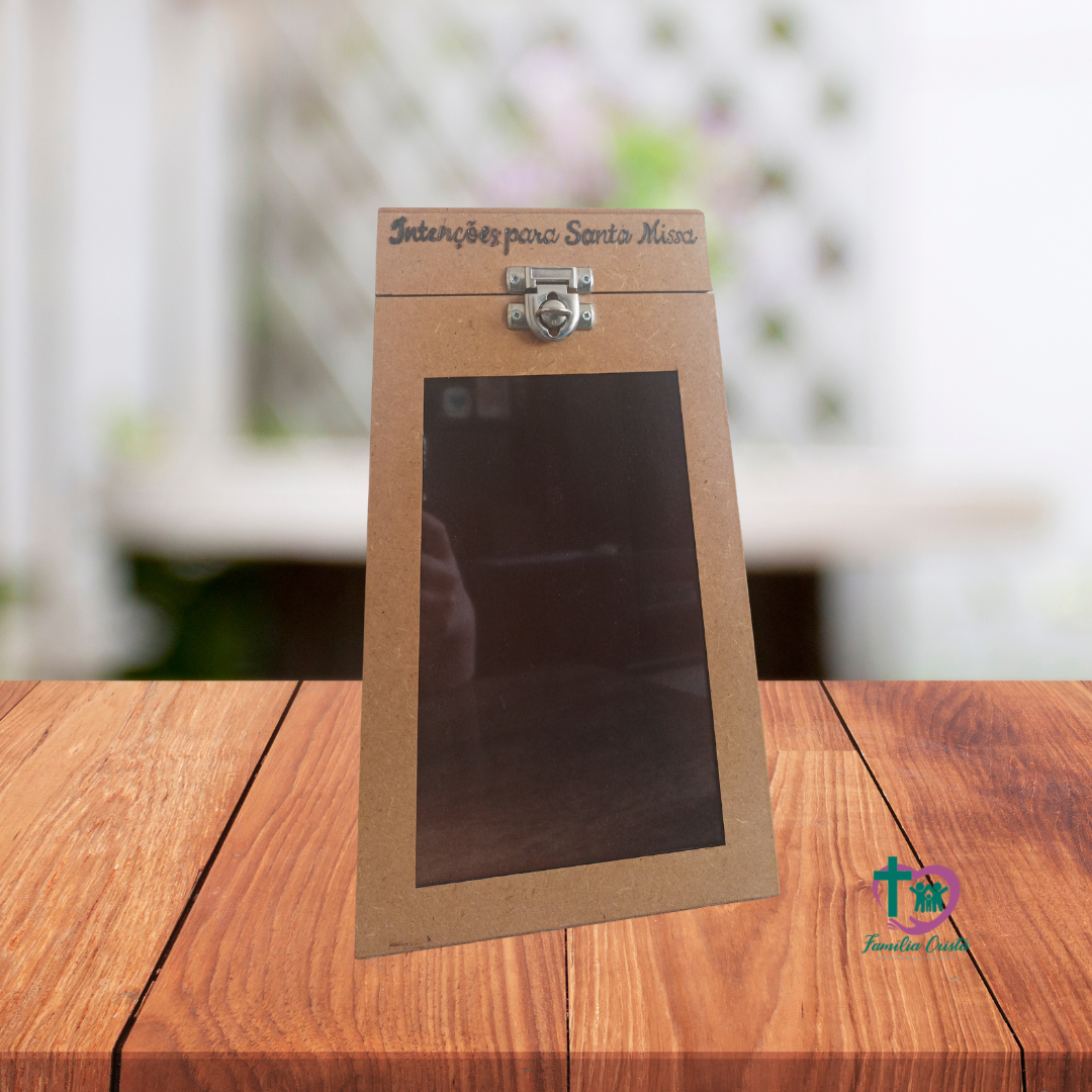 Caixa de MDF pintada a mão. Duas imagens (uma de cada lado) e texto acima do visor de acriclico.