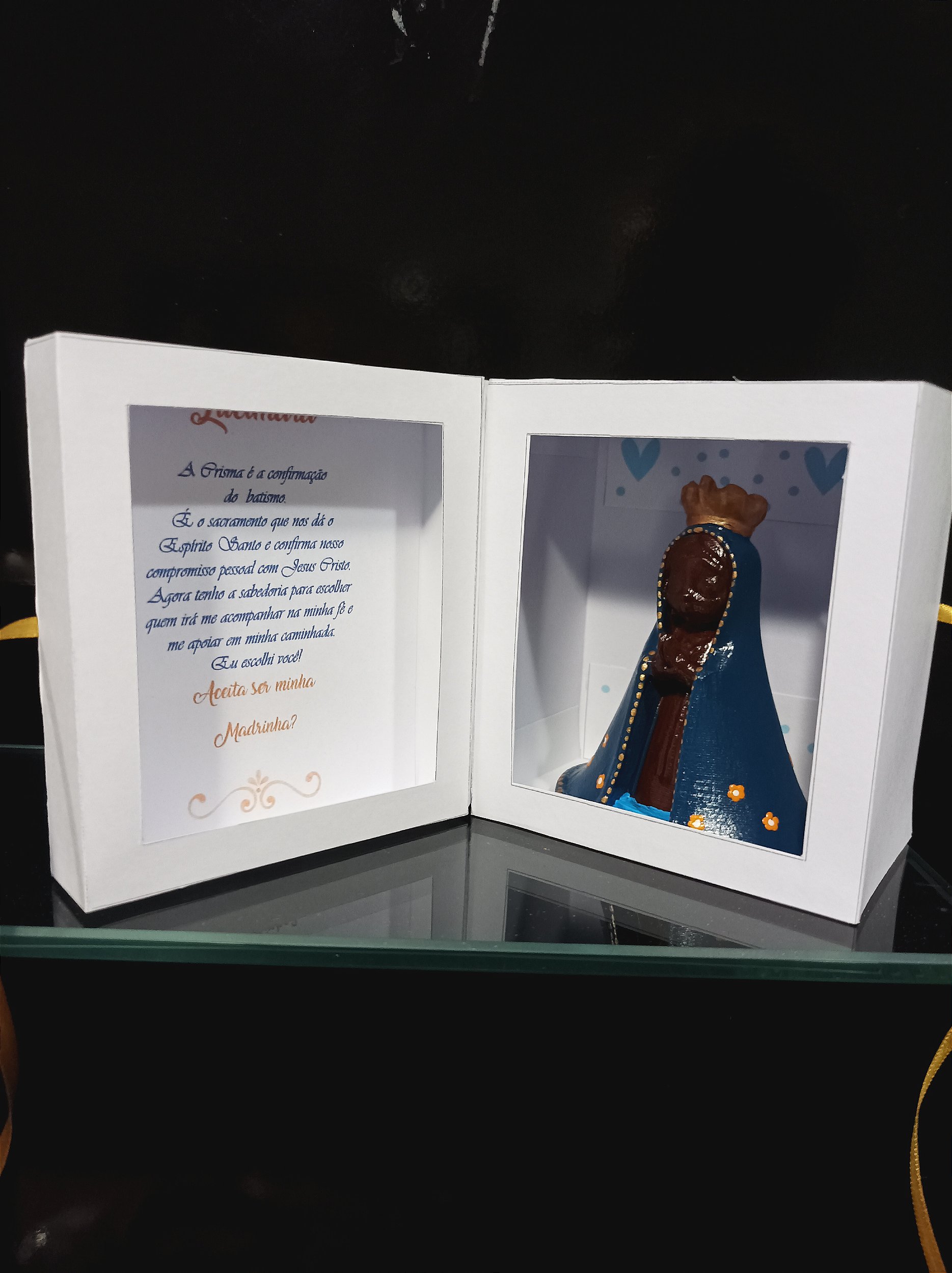 Convite especial em formato de caixinha com imagem 3D de Nossa Senhora,