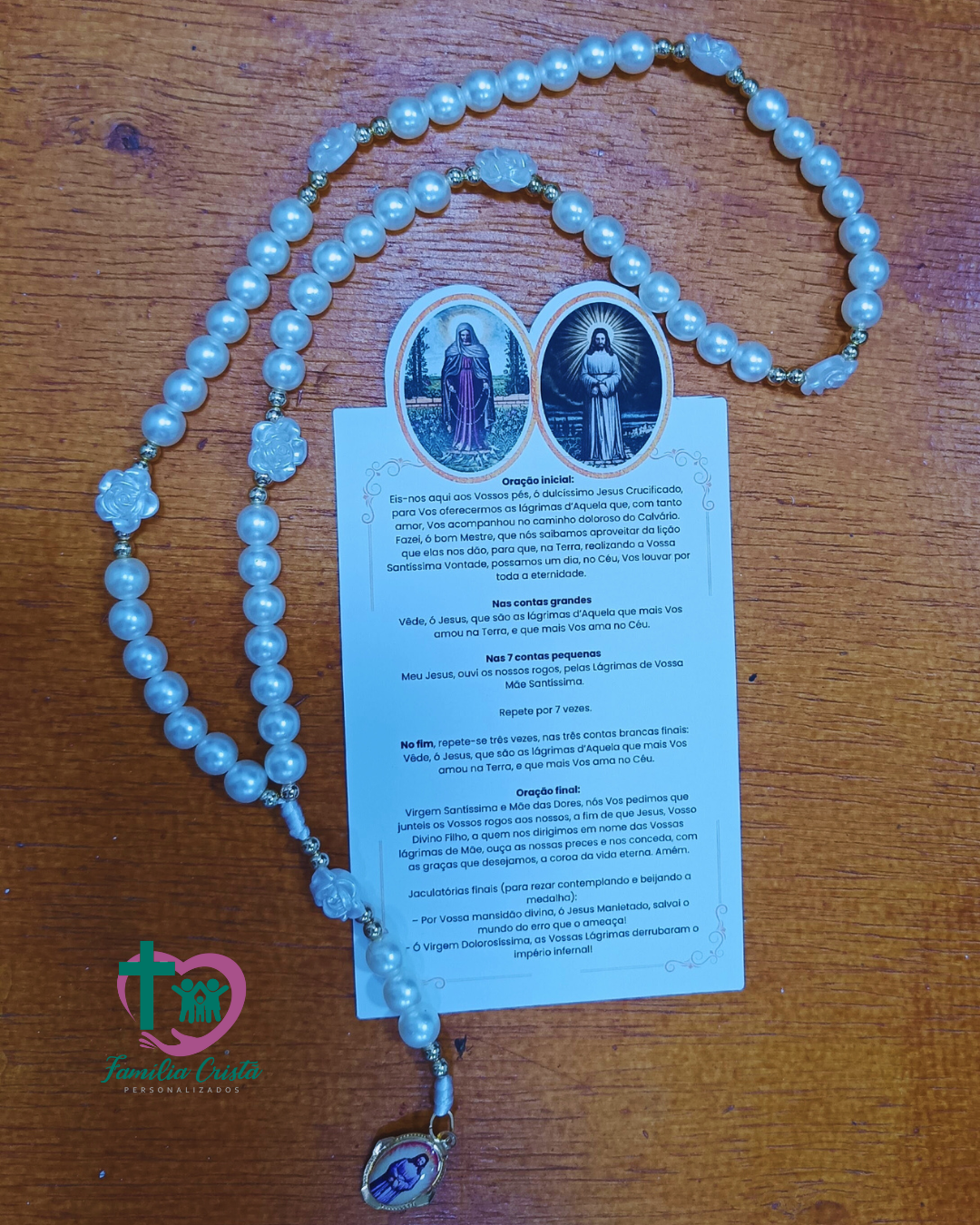 Terço de Nossa Senhora das Lágrimas com folheto de orações.
