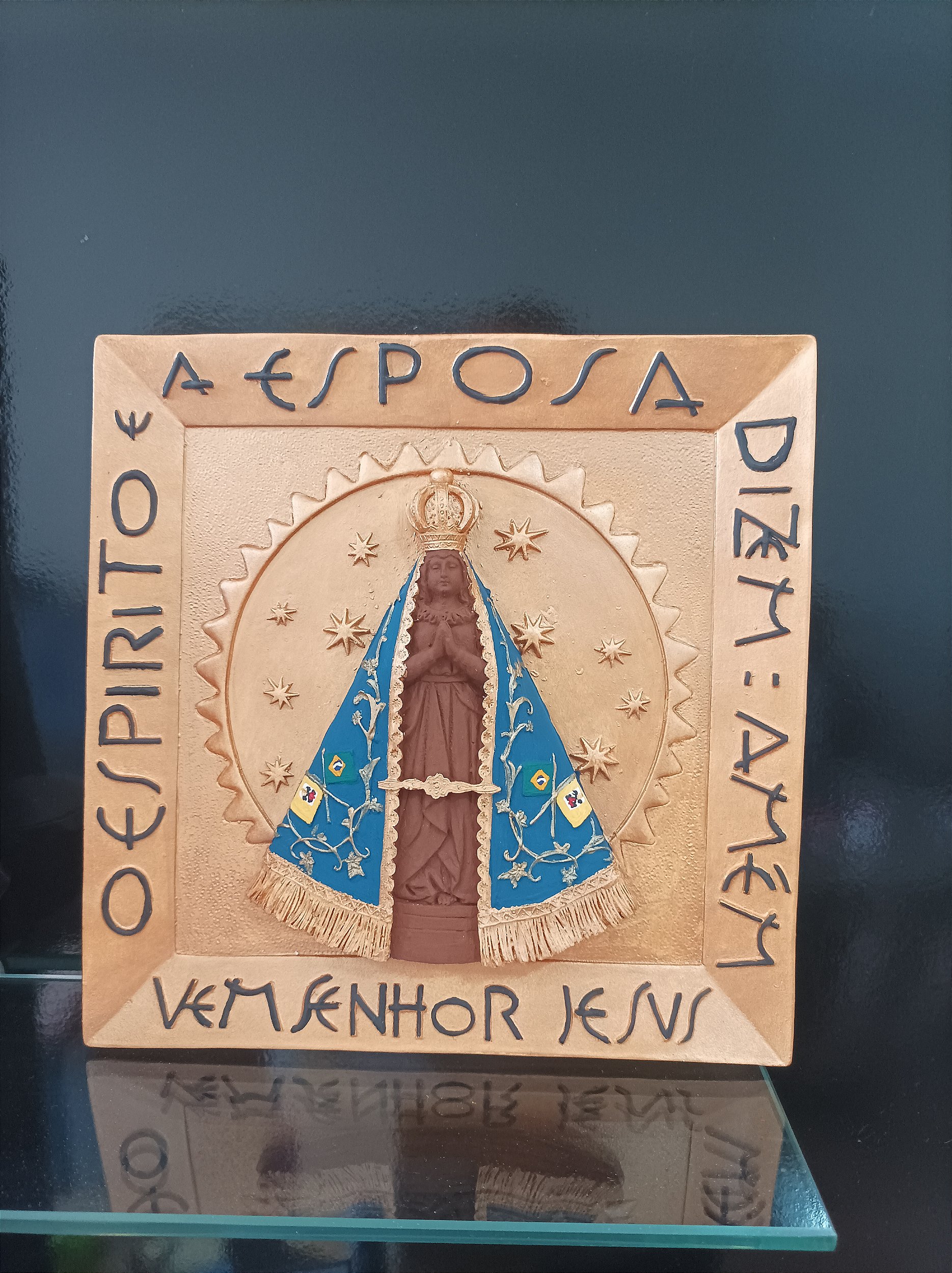 Linda obra pintada a mão com os detalhes e cores da imagem original de Nossa Senhora Aparecida.
