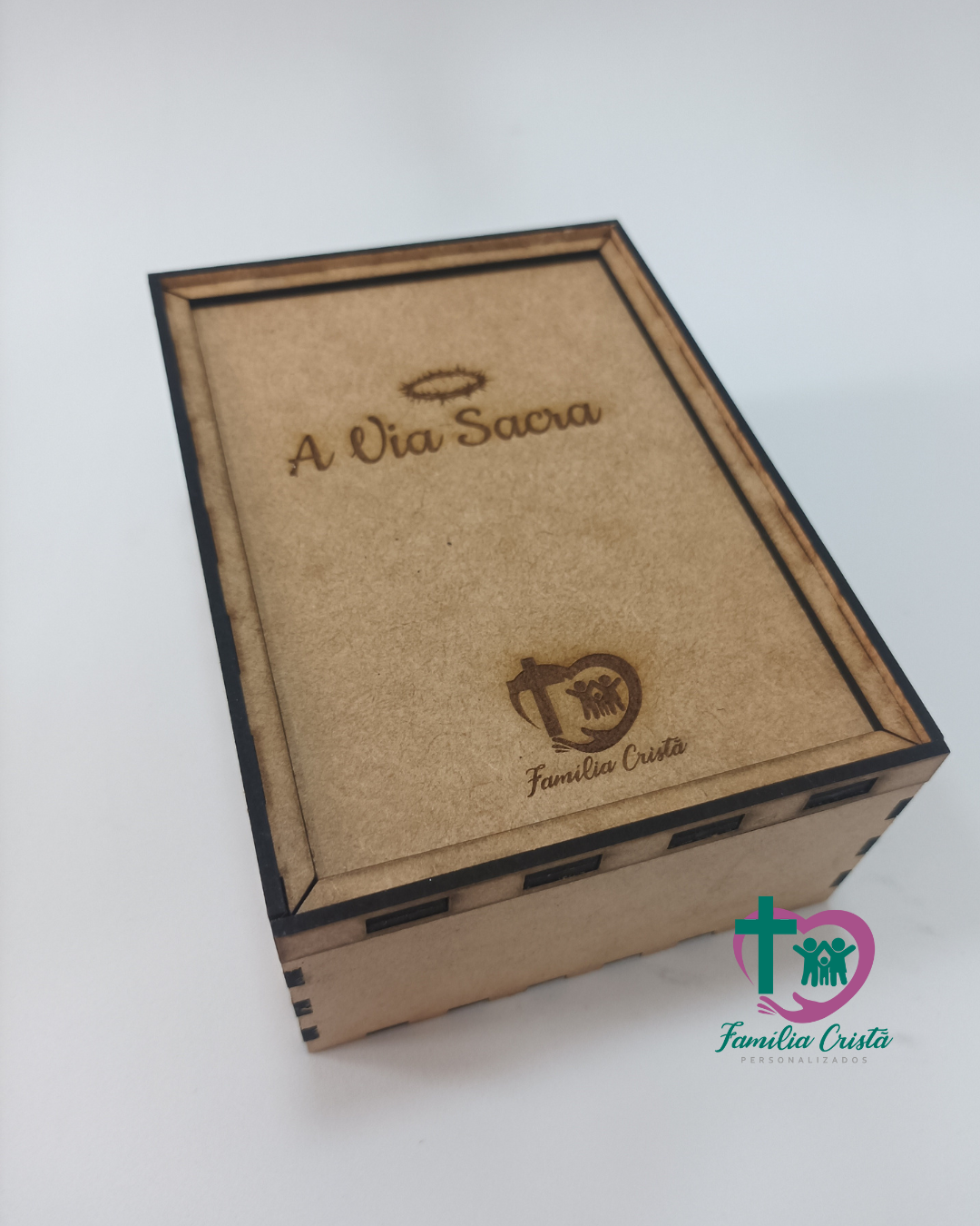 Kit Via Sacra com estojo de MDF gravado a laser, 14 quadros das estações, base para apoiar os quadros, livro de orações e vela de cera de abelha.